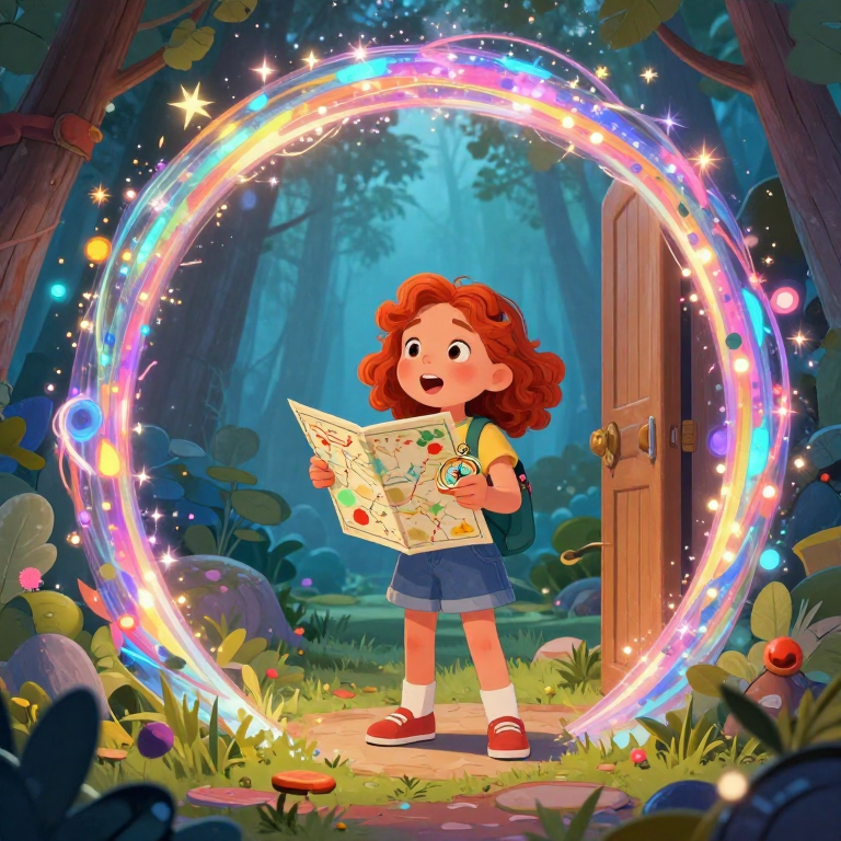 In this enchanting page from Alexis's A-Z adventure, we discover Amberlight. Alexis, with her red curls bouncing, holds a map and compass, ready to step into the magical portal that sparkles with colors in her backyard. This illustration captures the magic of own your keys, defend your attention, demand prove. Young readers will love exploring the letter A while learning about perseverance. The curious mood of this page creates a perfect moment for parent-child reading time. Recommended for ages 3-8.