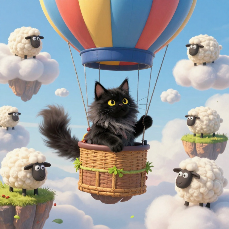 Discover Balloon in this enchanting page from Fluffy's A-Z adventure. Fluffy the fluffy black cat soars on a hot air balloon, spotting sheep grazing on sweet cotton candy clouds! Perfect for young readers ages 3-8.