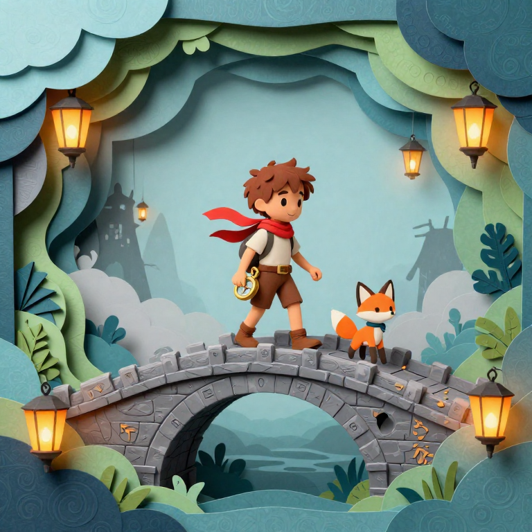 In this enchanting page from Astra & Comet (Paper Craft Edition)'s A-Z adventure, we discover Basilisk Bridge. Astra and Comet bravely cross the Basilisk Bridge, lanterns twinkling as ancient runes light their path. This illustration captures the magic of a brave girl and her loyal companion journey throu. Young readers will love exploring the letter B while learning about friendship. The brave mood of this page creates a perfect moment for parent-child reading time. Recommended for ages 3-8.