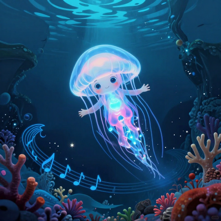 Discover Bioluminescence in this enchanting page from AI's A-Z adventure. AI floats above the deep, hugging glowing jellyfish as coral sings in blue light. Perfect for young readers ages 3-8.