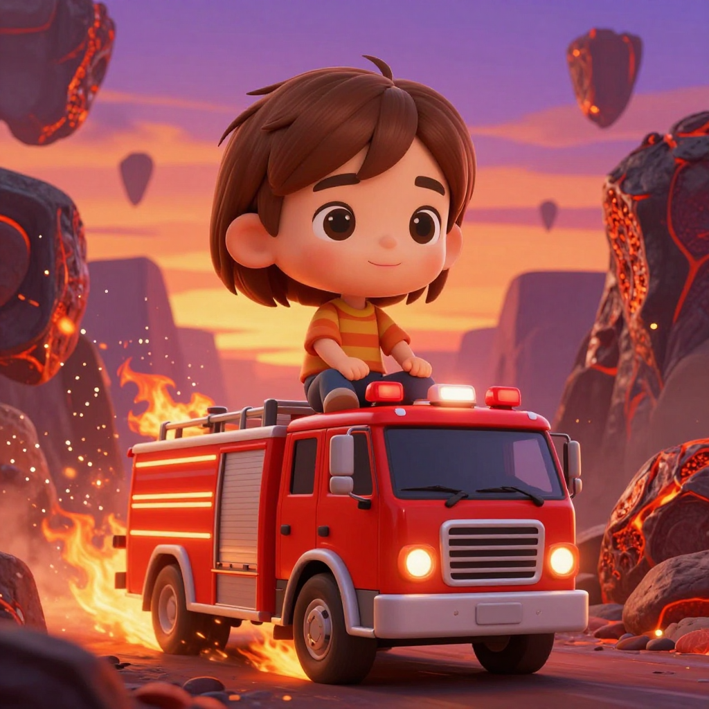 Discover Blazing in this enchanting page from Erden's A-Z adventure. Erden rides a fiery red truck through glowing lava rocks, sparks dancing like birthday fireworks in the sunset sky. Perfect for young readers ages 3-8.