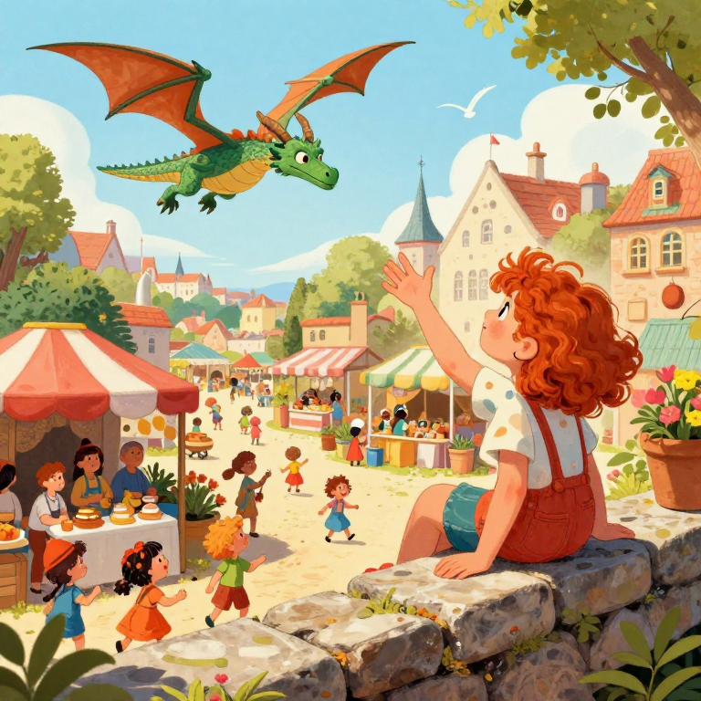 In this enchanting page from Alexis's A-Z adventure, we discover Bridgekeeper. Alexis, with her curly red hair dancing in the breeze, eagerly waves at a friendly dragon soaring over the bustling marketplace below. This illustration captures the magic of own your keys, defend your attention, demand prove. Young readers will love exploring the letter B while learning about friendship. The kind mood of this page creates a perfect moment for parent-child reading time. Recommended for ages 3-8.