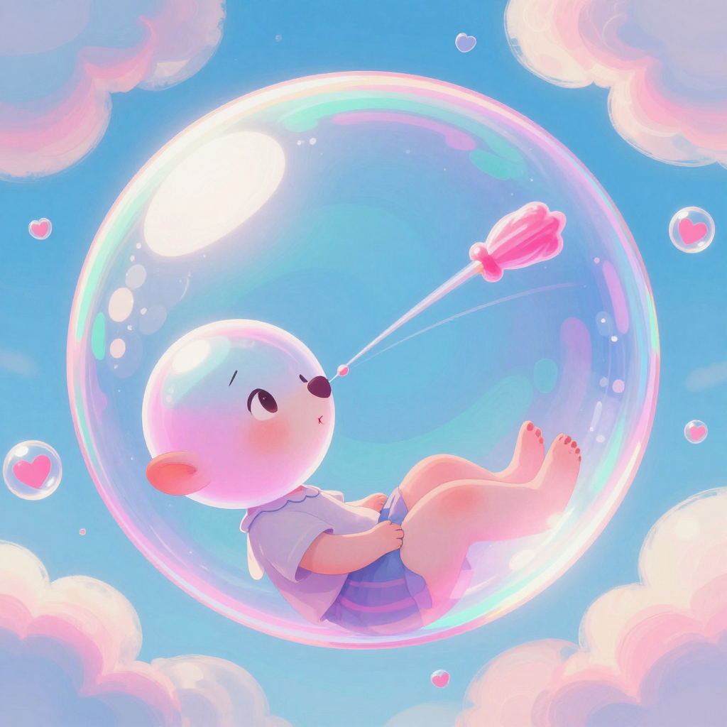 Discover Bubblegum in this enchanting page from Emeline's A-Z adventure. Emeline floats in a giant bubblegum bubble, licking a candy comet as heart-shaped bubbles drift like wishes. Perfect for young readers ages 3-8.