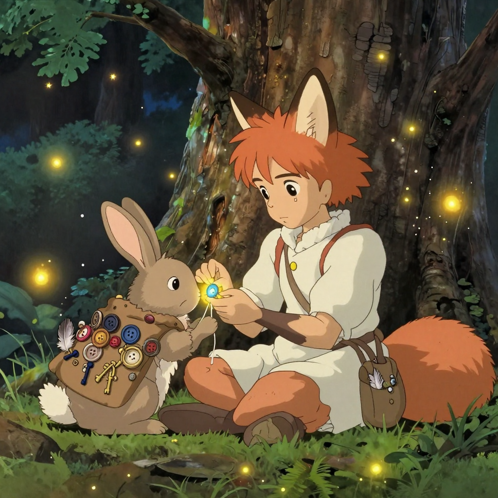 Discover Button in this enchanting page from Nori's A-Z adventure. Nori sews a glowing blue button on the rabbit’s coat as fireflies dance like tiny stars in the quiet oak’s glow. Perfect for young readers ages 3-8.