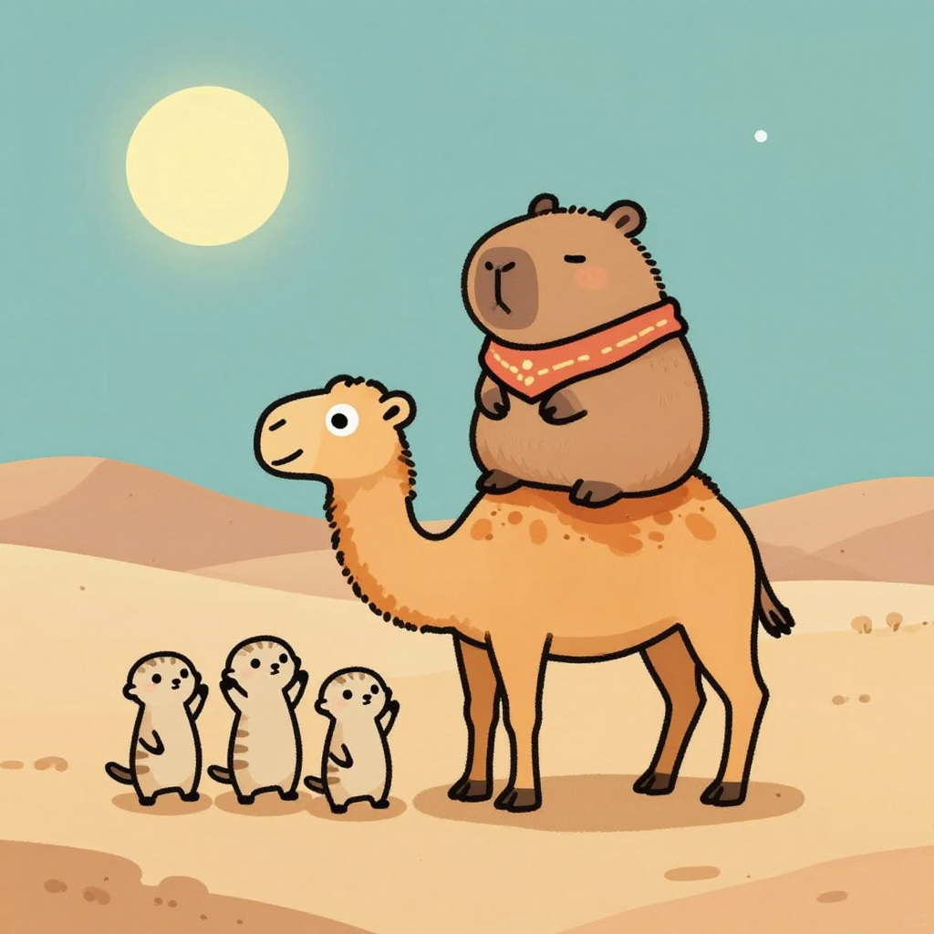 Discover Camel in this enchanting page from Kappy's A-Z adventure. Kappy the capybara giggles on a sleepy camel’s hump, under twinkling stars, as meerkats wave from the sand. Perfect for young readers ages 3-8.