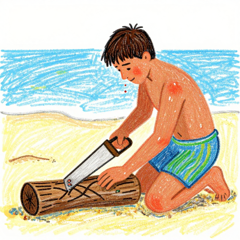 Discover Castigation in this enchanting page from Ined de Sade's A-Z adventure. Beneath the sun's fierce gaze, Ined dances with wood and sweat, carving tales of desire onto weathered driftwood. Perfect for young readers ages 3-8.