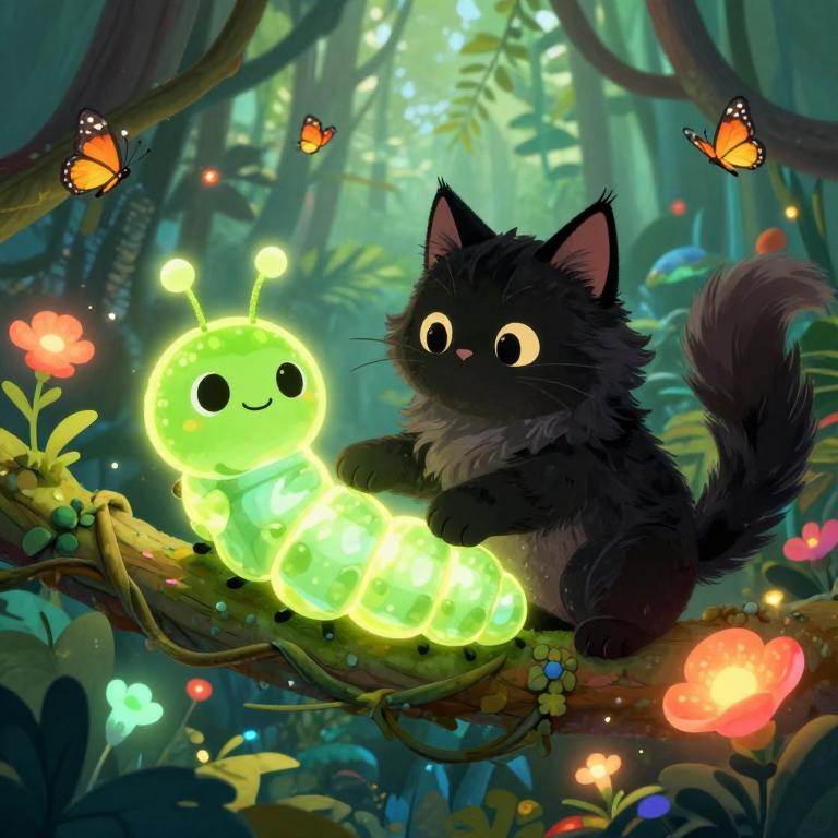 Discover Caterpillar in this enchanting page from Fluffy's A-Z adventure. In the heart of a glowing jungle, Fluffy the cat tenderly cares for his new friend, a sparkling caterpillar. Perfect for young readers ages 3-8.