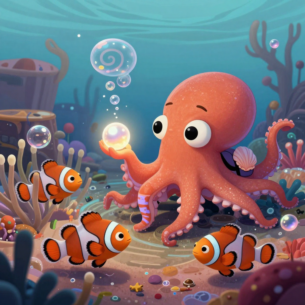 Discover Clownfish in this enchanting page from Bubbles's A-Z adventure. Bubbles guided the lost clownfish with wiggly tentacles and a glowing pearl, making the anemone maze feel like home. Perfect for young readers ages 3-8.