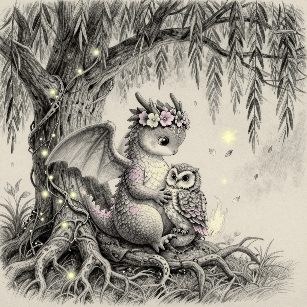 Discover Clutch in this enchanting page from Ember's A-Z adventure. Ember cradles the baby owl as glowing roots and floating petals weave a soft, fiery cradle under twilight’s hush. Perfect for young readers ages 3-8.