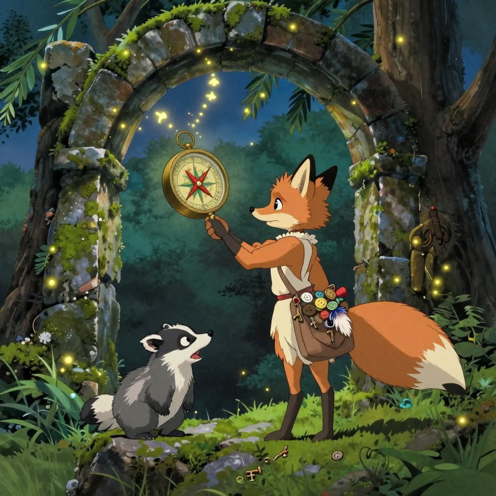 Discover Compass in this enchanting page from Nori's A-Z adventure. Nori’s compass glows as fireflies paint a path to the willow, guiding the wide-eyed badger pup home. Perfect for young readers ages 3-8.