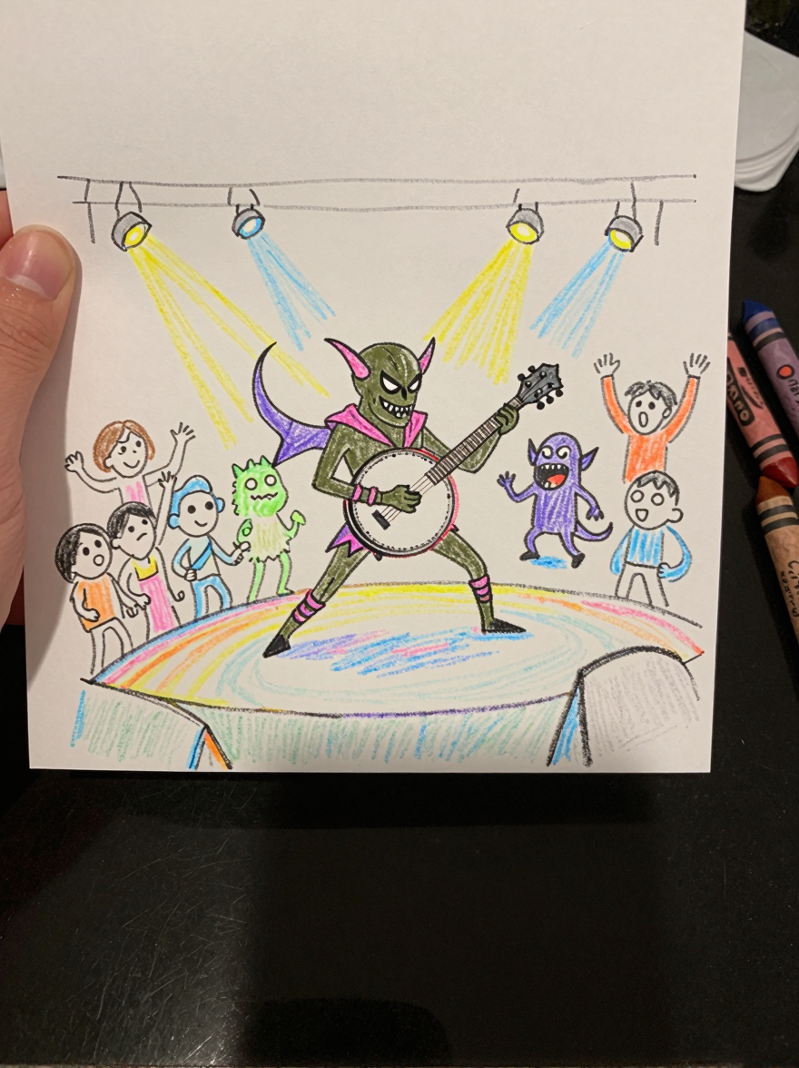 Discover Concert in this enchanting page from Olive the Demon Hunter's A-Z adventure. Olive strums her electric banjo, chasing shadows with rainbow notes while monsters cheer and crayons dance in the light. Perfect for young readers ages 3-8.