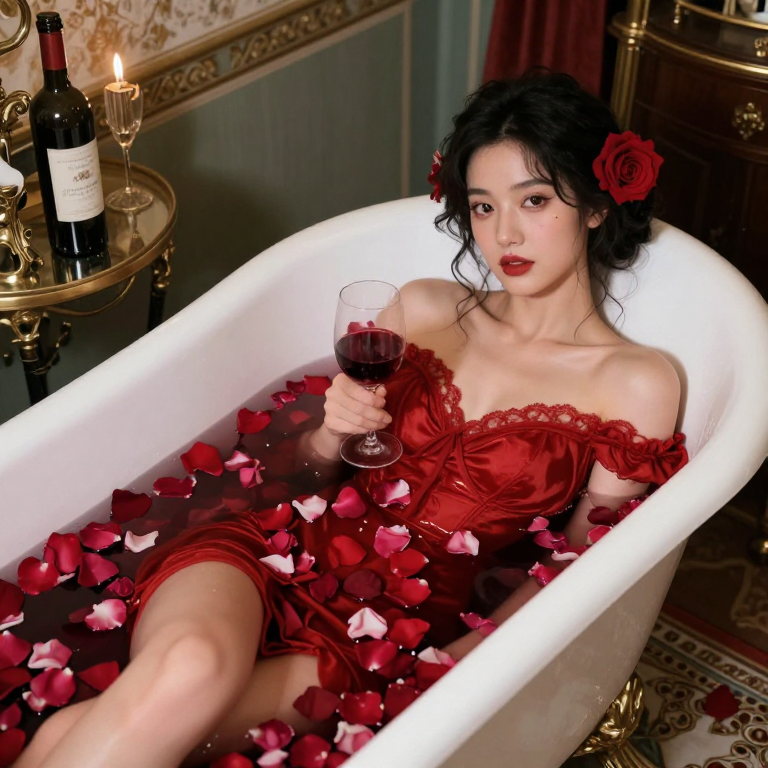 Discover Crimson—a woman in in this enchanting page from Adult ABCs's A-Z adventure. Crimson floats in a tub of rose petals, bathed in golden light like a painting come to life. Perfect for young readers ages 3-8.