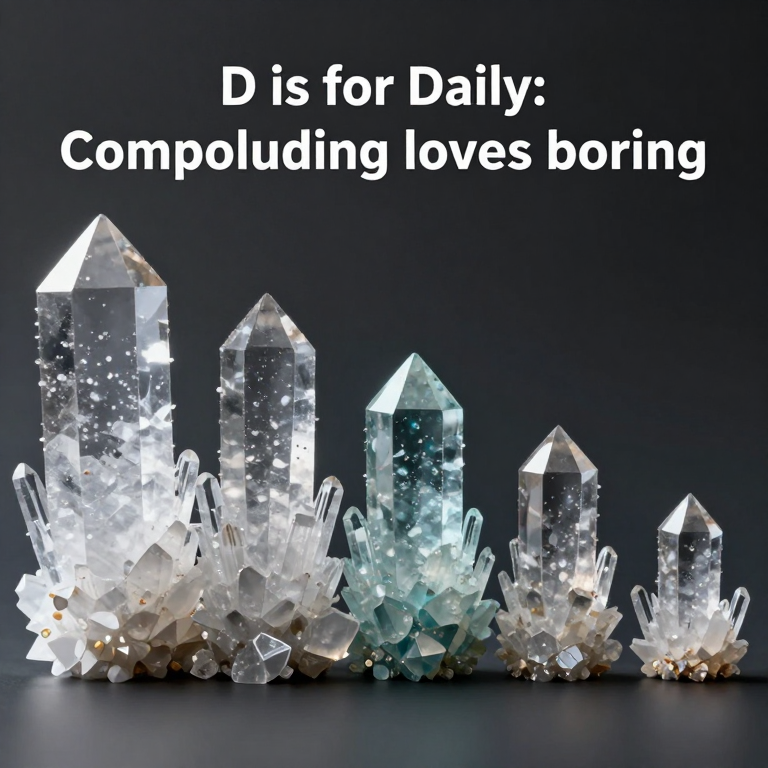 Discover Daily in this enchanting page from GPT Pro Sutras's A-Z adventure. Tiny daily habits grow into shimmering crystal towers—boring days make big magic! Perfect for young readers ages 3-8.