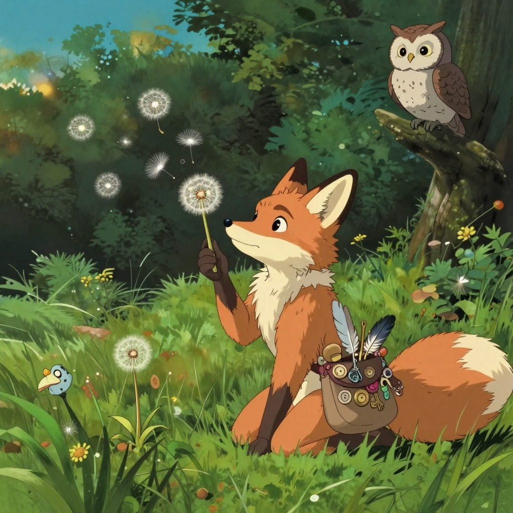 Discover Dandelion in this enchanting page from Nori's A-Z adventure. Nori blows dandelion seeds that glow with childhood memories, making the owl smile in the dusk’s golden hush. Perfect for young readers ages 3-8.