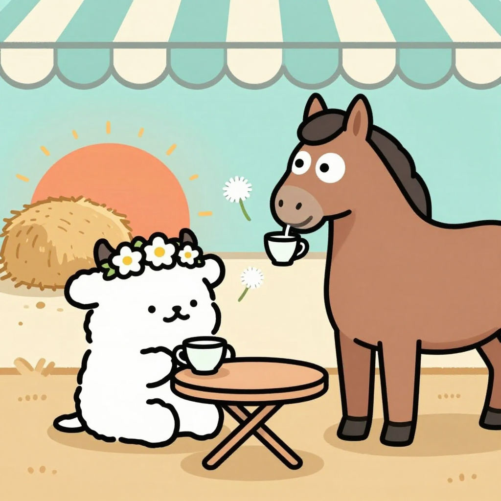 Discover Date in this enchanting page from µ's A-Z adventure. Daisy-crowned D sits with a elegant horse, sipping tea as dandelions float in the golden sunset. Perfect for young readers ages 3-8.