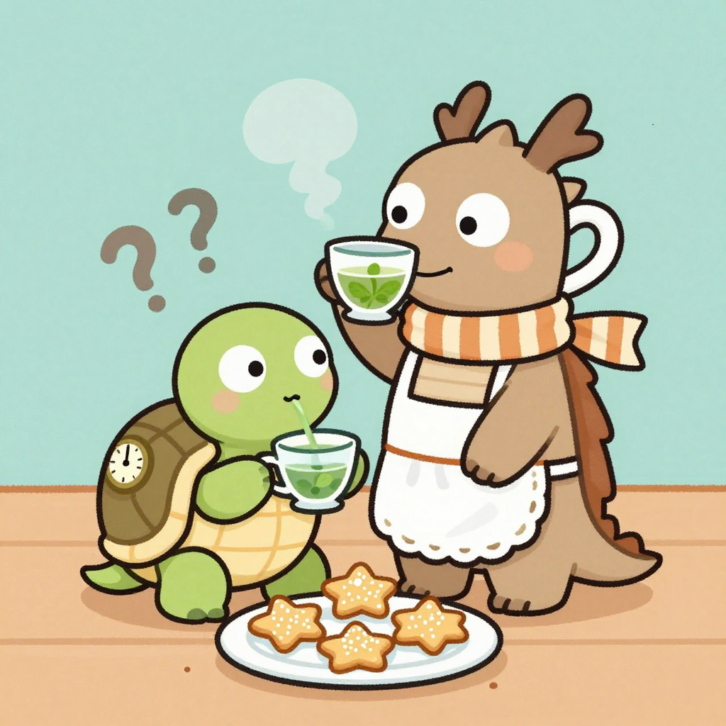 Discover Dragon Tea Party in this enchanting page from Tilly's A-Z adventure. Tilly sips tea from a thimble as the dragon blows question-mark steam, her scarf dangling like a sleepy ribbon. Perfect for young readers ages 3-8.