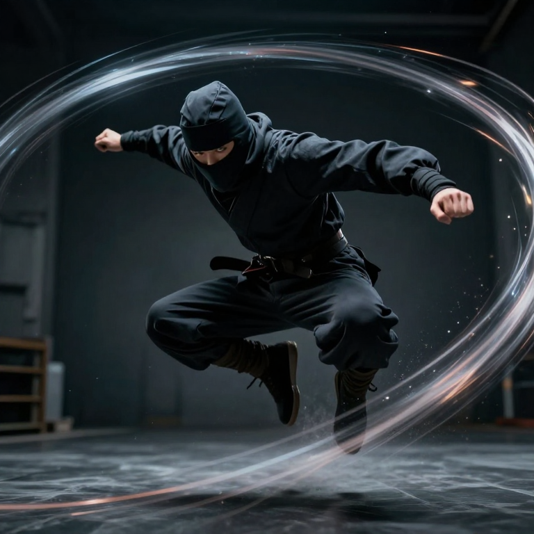 Discover dynamic cyber-ninja mid-flip in this enchanting page from Pulse's A-Z adventure. A cyber-ninja flips through shadows, glowing trails swirling like starlight. Perfect for young readers ages 3-8.