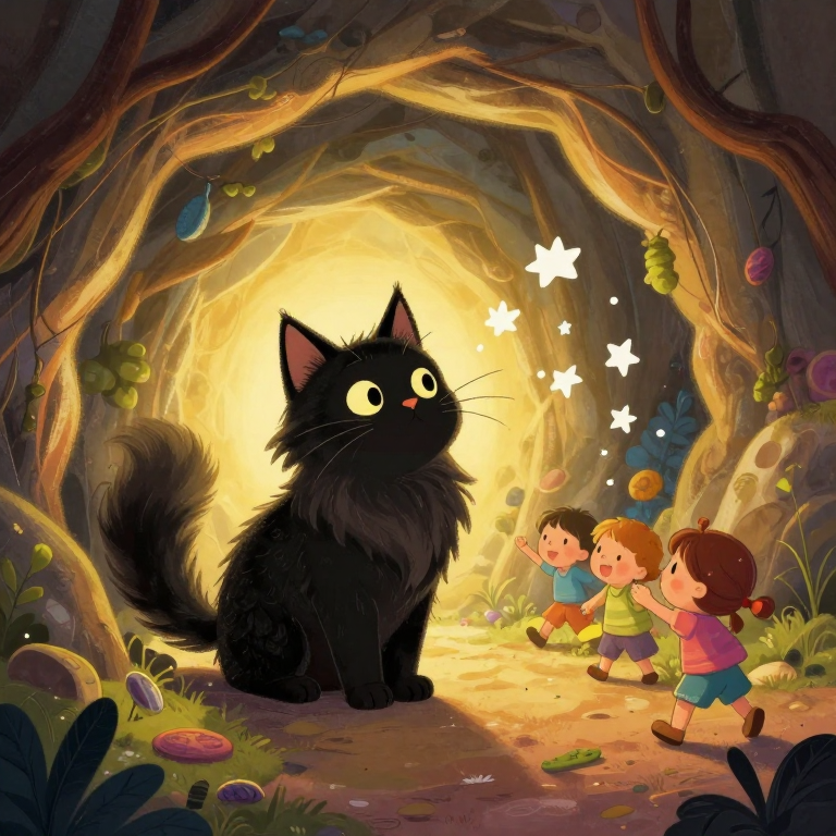 Discover Echo in this enchanting page from Fluffy's A-Z adventure. Fluffy the fluffy black cat peers into the glowing cavern, curious about the echoing purrs calling from within. Perfect for young readers ages 3-8.