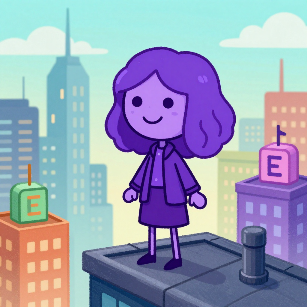 Discover Empire in this enchanting page from Olive the Demon Hunter's A-Z adventure. Olive, the purple marker girl with wavy hair, smiles from her rooftop as magic buildings save the world. Perfect for young readers ages 3-8.
