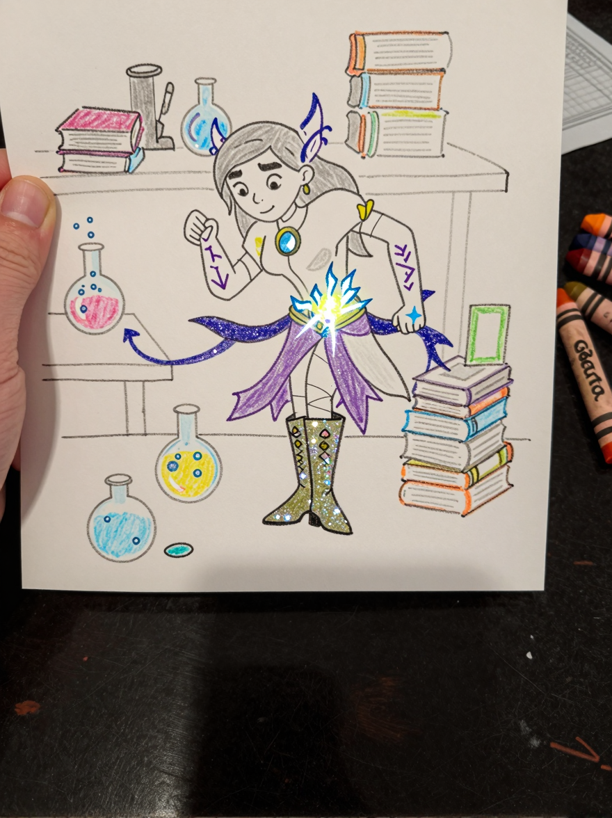 Discover Enchantment in this enchanting page from Olive the Demon Hunter's A-Z adventure. Olive paints sparkly runes on her boots, giggling as potions fizz and spellbooks tumble nearby. Perfect for young readers ages 3-8.