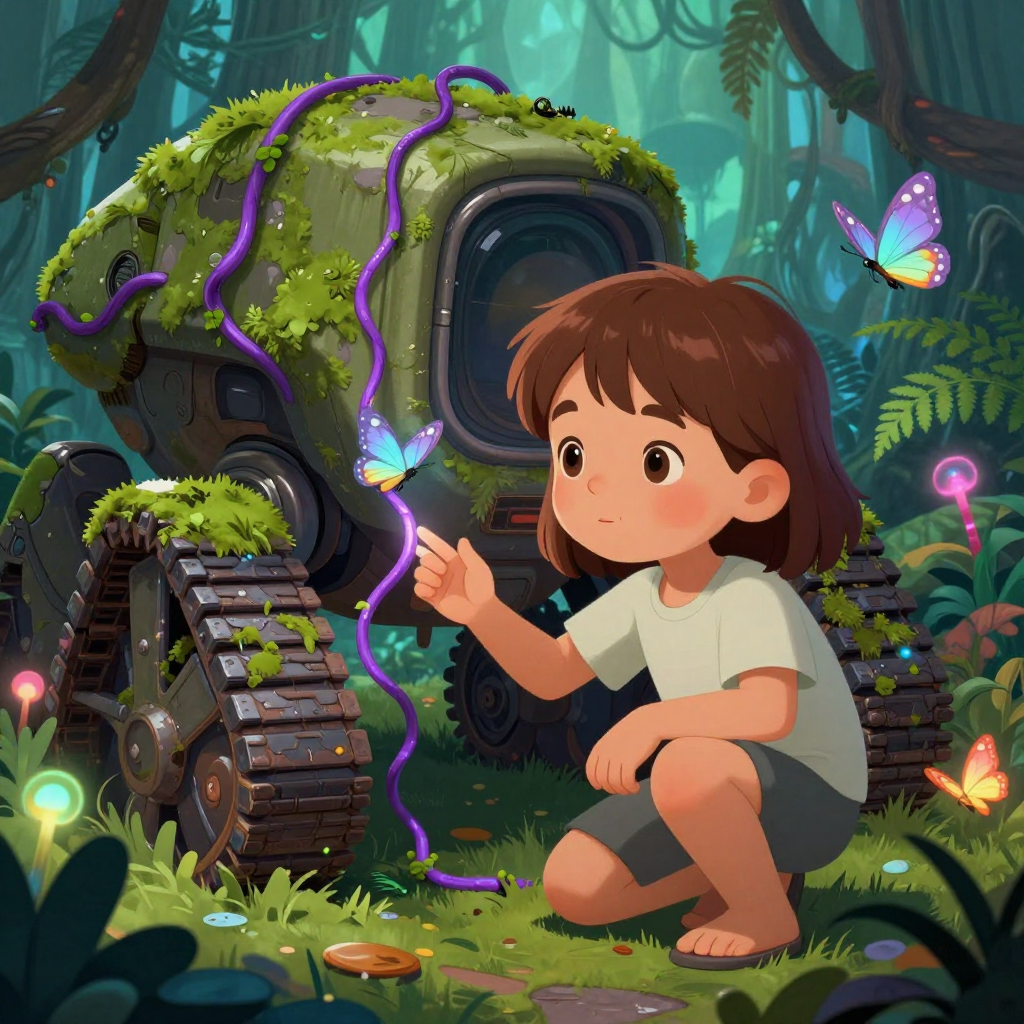 Discover Exploring in this enchanting page from Erden's A-Z adventure. Erden’s tiny fingers brushed the glowing vine as butterflies danced around the sleepy space crawler. Perfect for young readers ages 3-8.