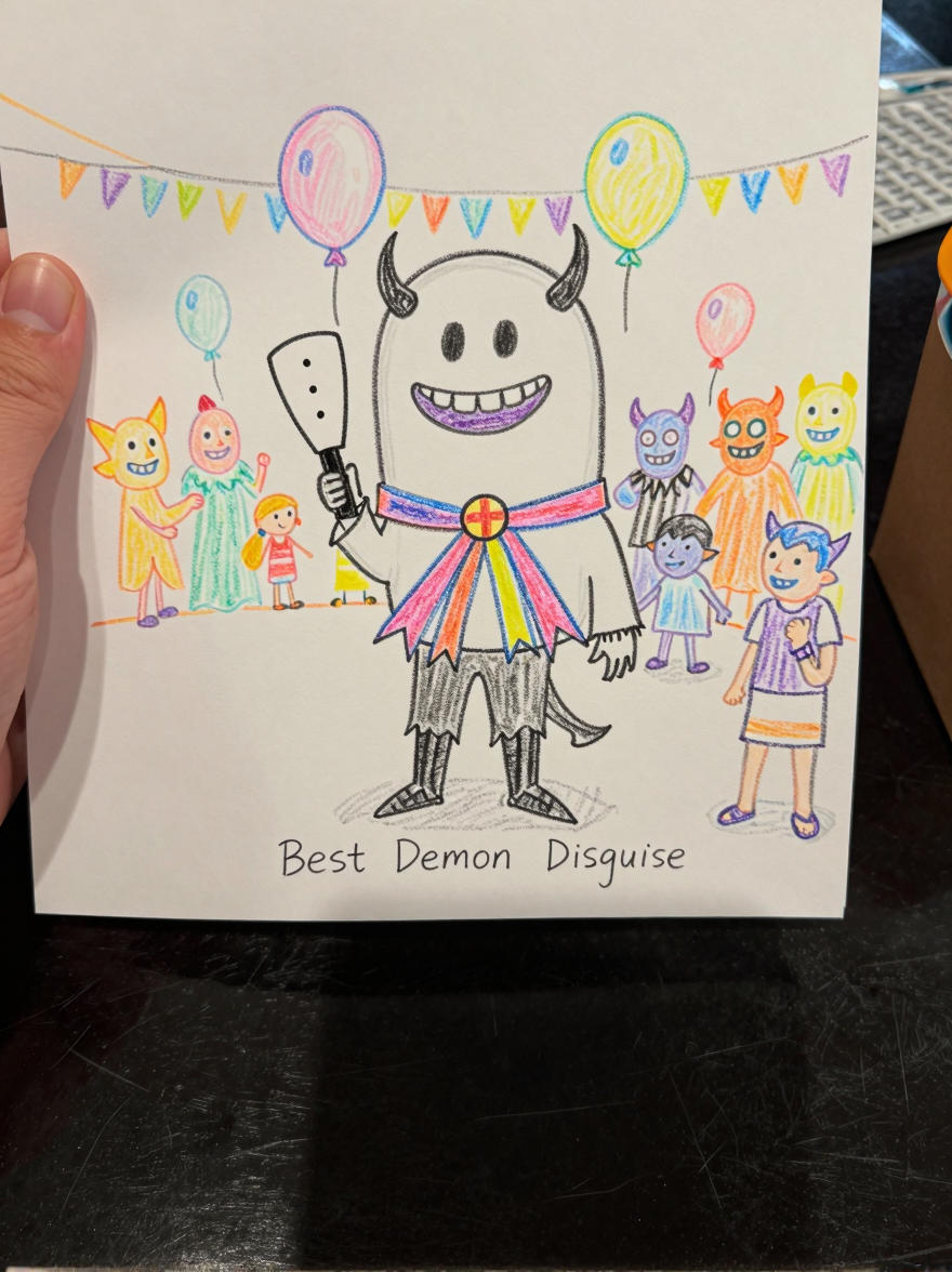 Discover Festival in this enchanting page from Olive the Demon Hunter's A-Z adventure. Olive the Demon Hunter smiles, holding her paddle as colorful demons wiggle for first prize. Perfect for young readers ages 3-8.