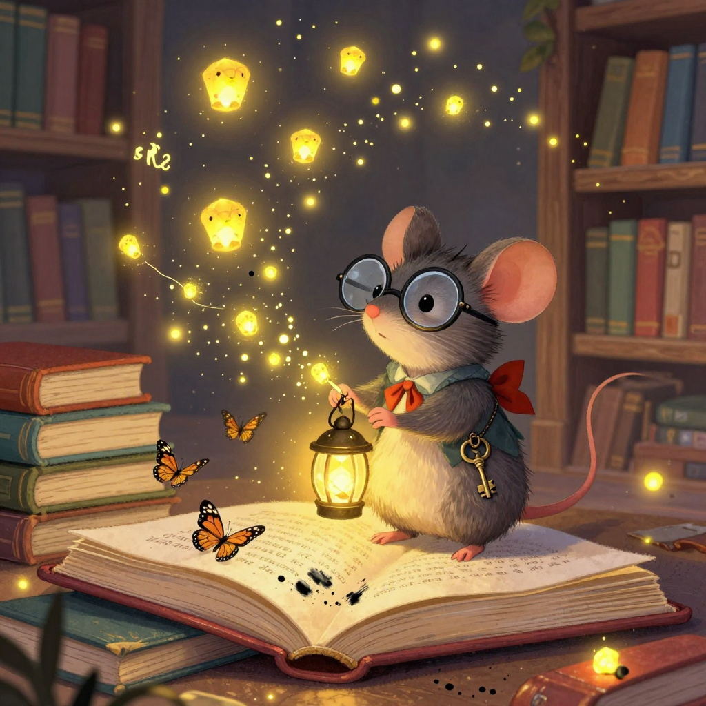 Discover Fireflies in this enchanting page from Mira's A-Z adventure. Mira cups glowing fireflies that dance above books, painting stories in golden light. Perfect for young readers ages 3-8.