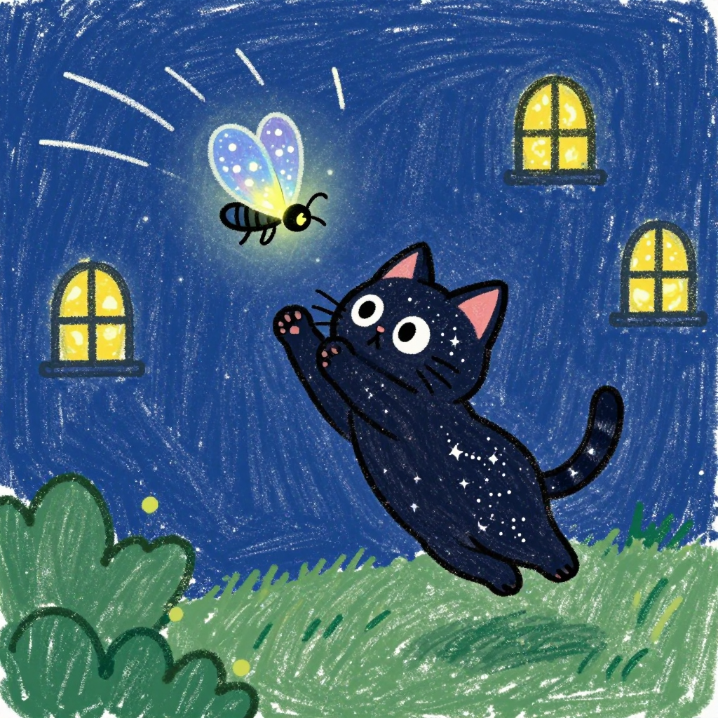 Discover Firefly in this enchanting page from Luna Cray's A-Z adventure. Luna leaps at a glowing firefly, her starry fur shimmering in the warm night air. Perfect for young readers ages 3-8.