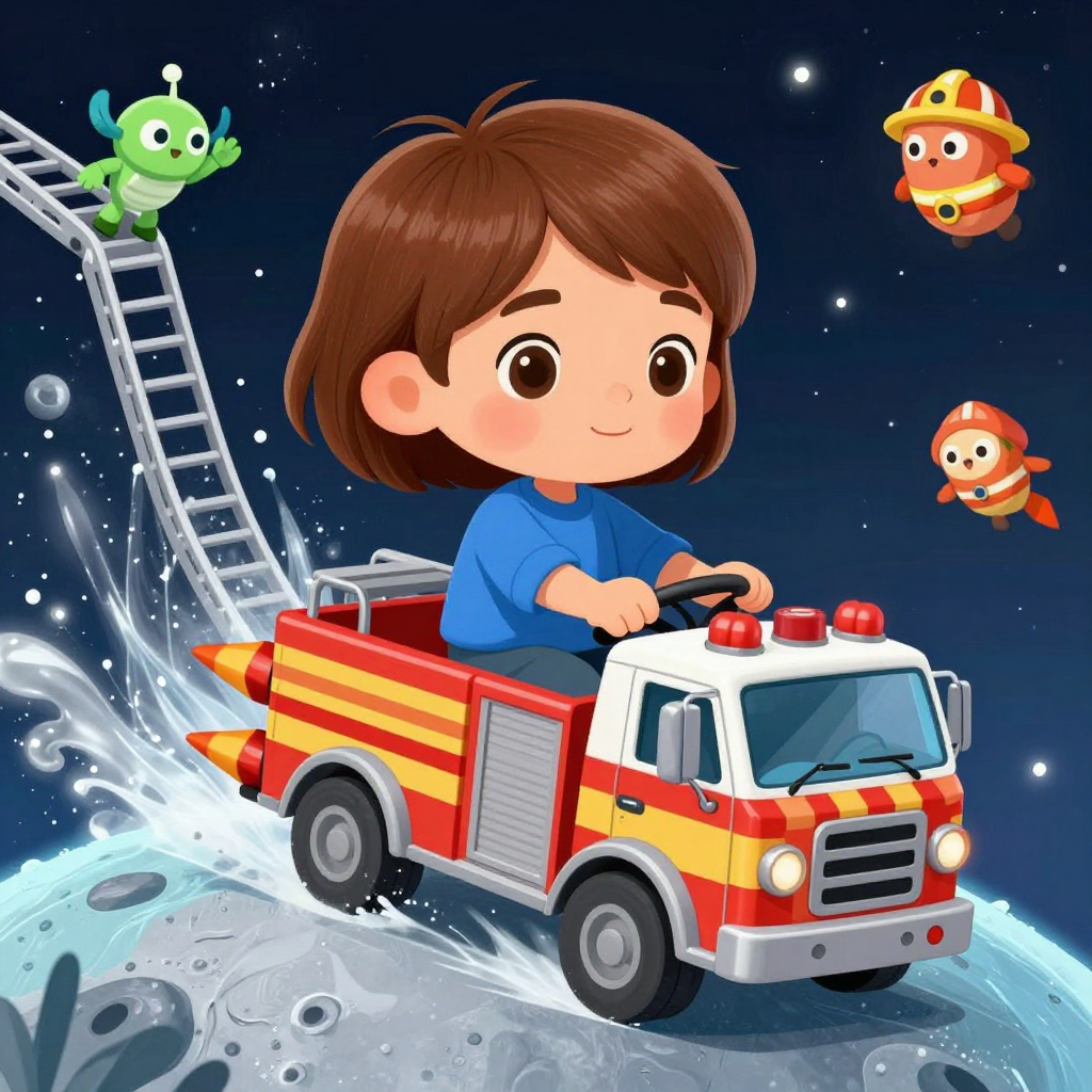 Discover Firetruck in this enchanting page from Erden's A-Z adventure. Erden steers a candy firetruck on an ice moon, splashing silver waterfalls into space as tiny aliens wave from the ladder. Perfect for young readers ages 3-8.