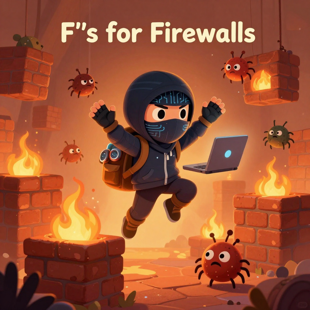 Discover Firewalls in this enchanting page from Mark the Ninja Acrobat Engineer's A-Z adventure. Mark the ninja engineer flips past glowing firewalls, dodging grumpy bug sprites with a giggle and a gadget. Perfect for young readers ages 3-8.