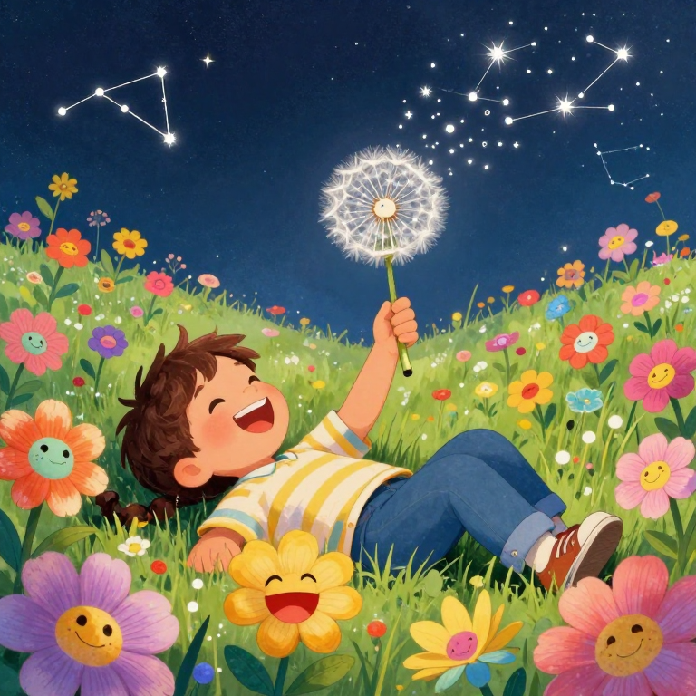 Discover Flora in this enchanting page from AI's A-Z adventure. Flora laughs as a giggling flower gives her a dandelion clock that turns into twinkling stars. Perfect for young readers ages 3-8.