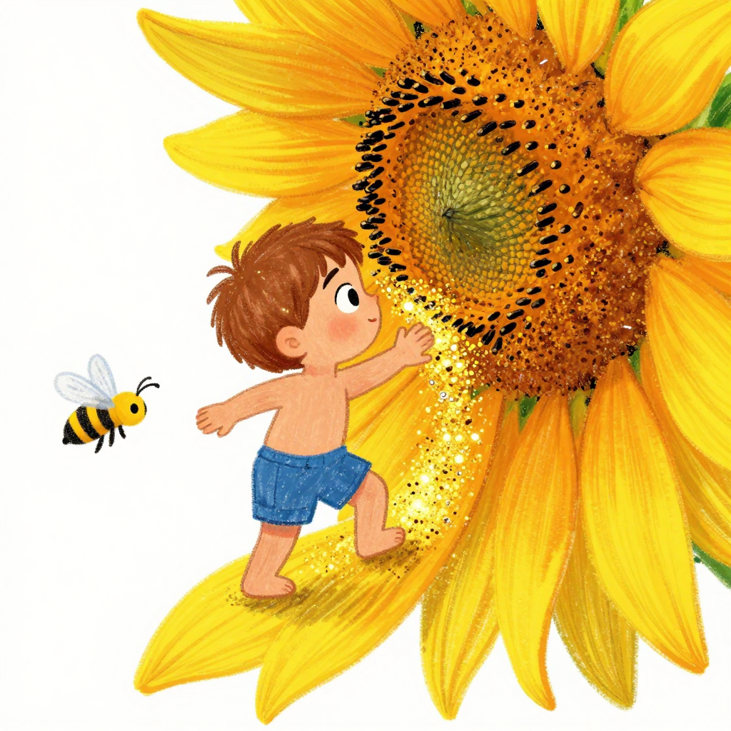 Discover Flower in this enchanting page from Amber's A-Z adventure. Amber tiptoes on a sunflower, catching glowing pollen as it leans down to kiss her forehead. Perfect for young readers ages 3-8.