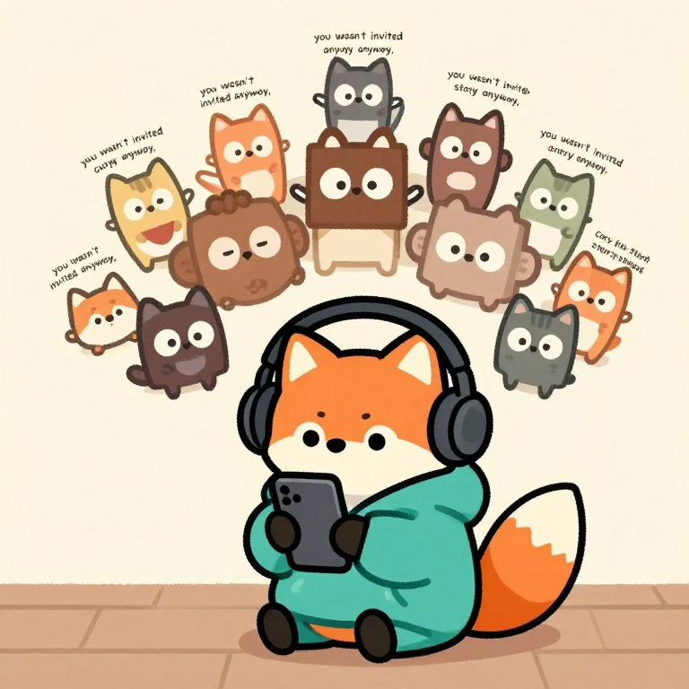 Discover FOMO in this enchanting page from Jax's A-Z adventure. Jax the fox scrolls alone, while party bubbles whisper, “You weren’t invited anyway.” Perfect for young readers ages 3-8.