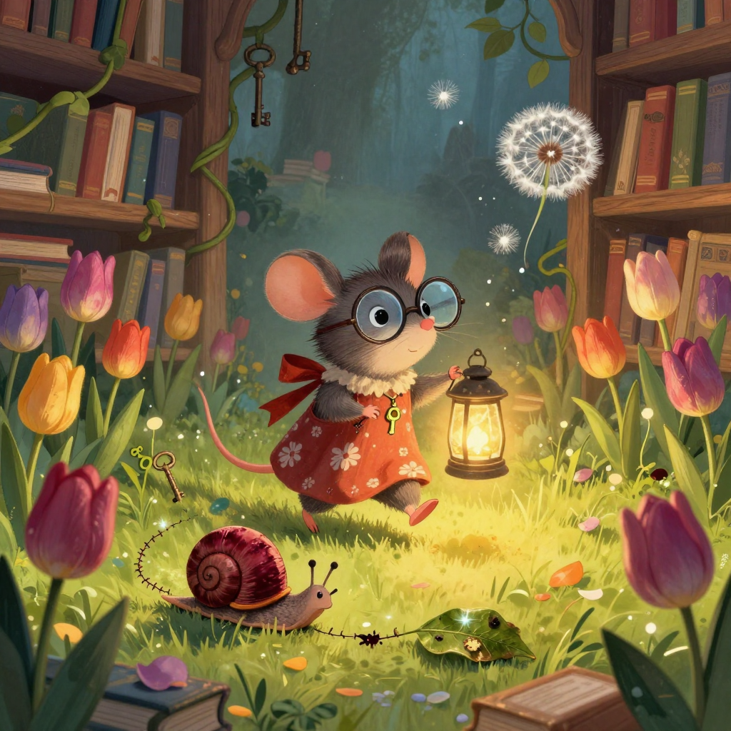 Discover Garden in this enchanting page from Mira's A-Z adventure. Mira tiptoes through a glowing book-garden where page-petals bloom and velvet snails paint trails of shimmering ink. Perfect for young readers ages 3-8.