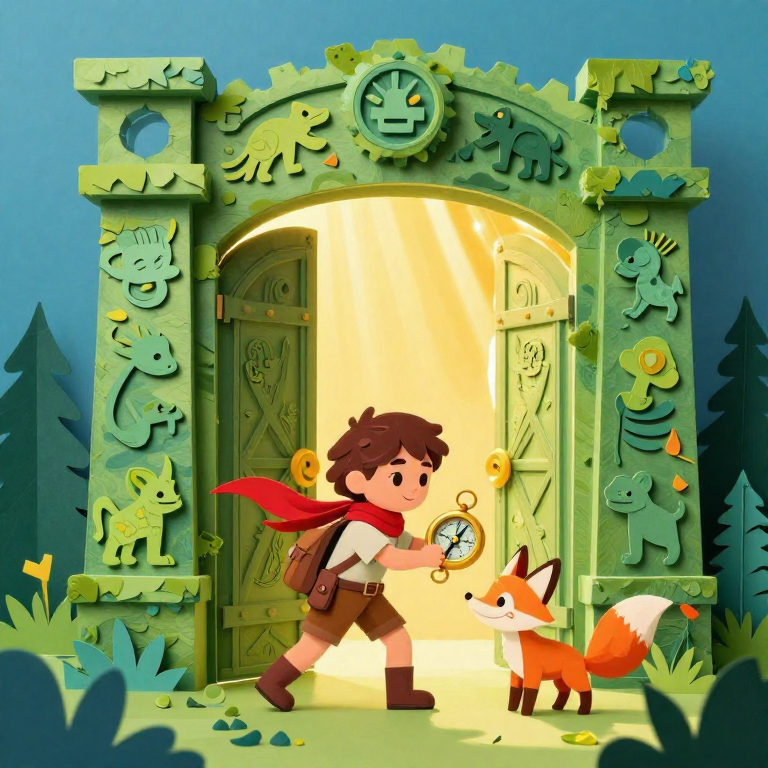 In this enchanting page from Astra & Comet (Paper Craft Edition)'s A-Z adventure, we discover Giant Gate. Astra and Comet pushed open the giant gate, revealing a world of golden light and magical creatures. This illustration captures the magic of a brave girl and her loyal companion journey throu. Young readers will love exploring the letter G while learning about friendship. The brave mood of this page creates a perfect moment for parent-child reading time. Recommended for ages 3-8.