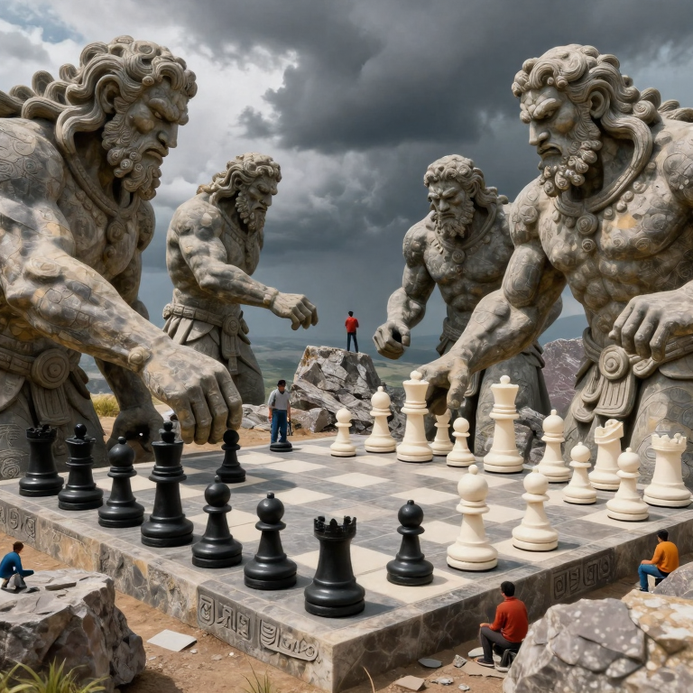 In this enchanting page from Clianthus's A-Z adventure, we discover Giants’ Chess Game. In the shadow of ancient giants, a dance of fate unfolds as flesh becomes stone beneath the looming thunder. This illustration captures the magic of a child’s awe-filled journey through surreal, dyin. Young readers will love exploring the letter G while learning about wonder and exploration. The curious mood of this page creates a perfect moment for parent-child reading time. Recommended for ages 3-8.
