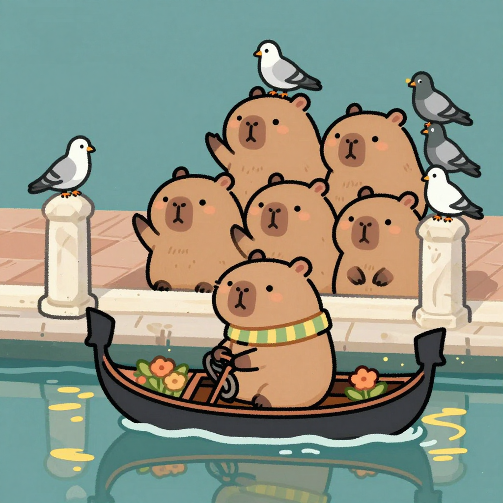 Discover Gondola in this enchanting page from Kappy's A-Z adventure. Kappy the capybara steers a flower-gondola at twilight, waving to singing pigeons as golden ripples dance below. Perfect for young readers ages 3-8.