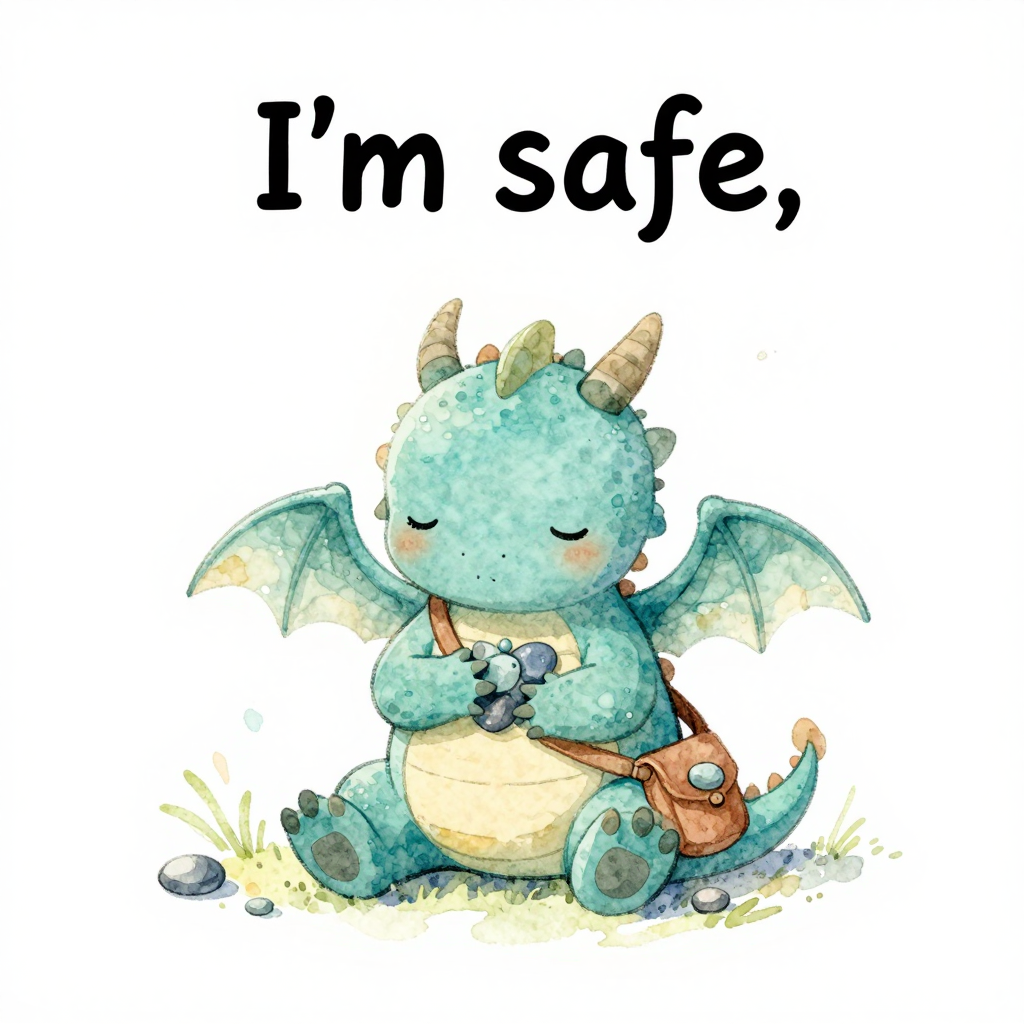 Discover Hand on Heart in this enchanting page from Milo the Worry Dragon's A-Z adventure. Milo the tiny dragon whispers, “I’m safe,” his heart slow and warm under his paw. Perfect for young readers ages 3-8.