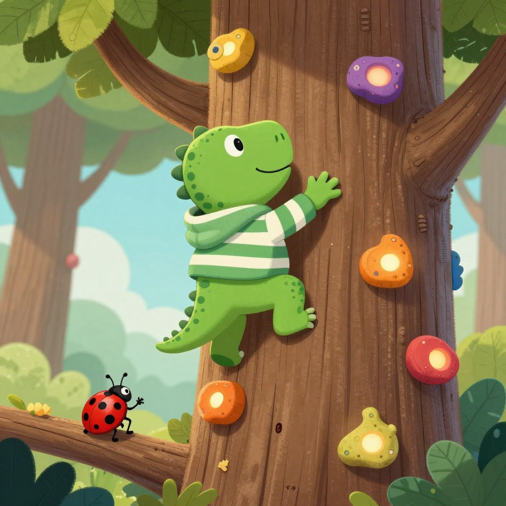 Discover Handholds in this enchanting page from Pipkin's A-Z adventure. Pipkin climbs the glowing tree, tiny hands gripping colorful holds as a ladybug waves below. Perfect for young readers ages 3-8.