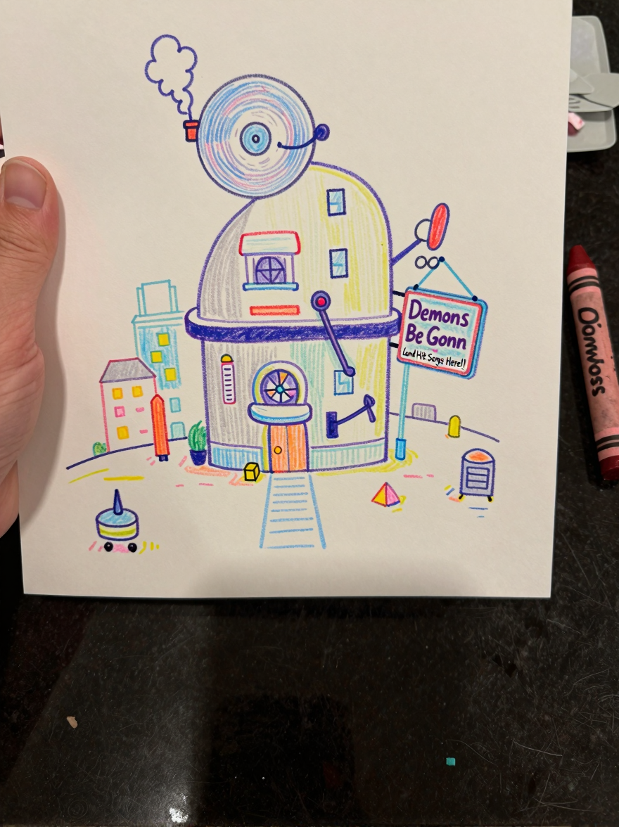 Discover Headquarters in this enchanting page from Olive the Demon Hunter's A-Z adventure. Olive’s record-player HQ hums with music and smoke, dancing in a crayon-colored city where demons get booted—and songs take flight! Perfect for young readers ages 3-8.
