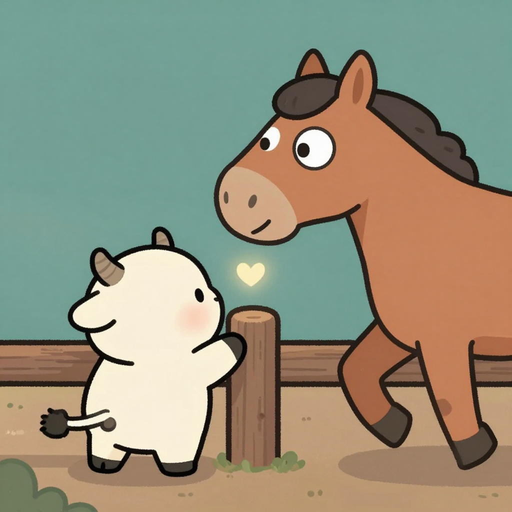 Discover Heartbeat in this enchanting page from µ's A-Z adventure. A tiny cow breathes a glowing heart into the dusk, watching the horse trot away with wide, wondering eyes. Perfect for young readers ages 3-8.