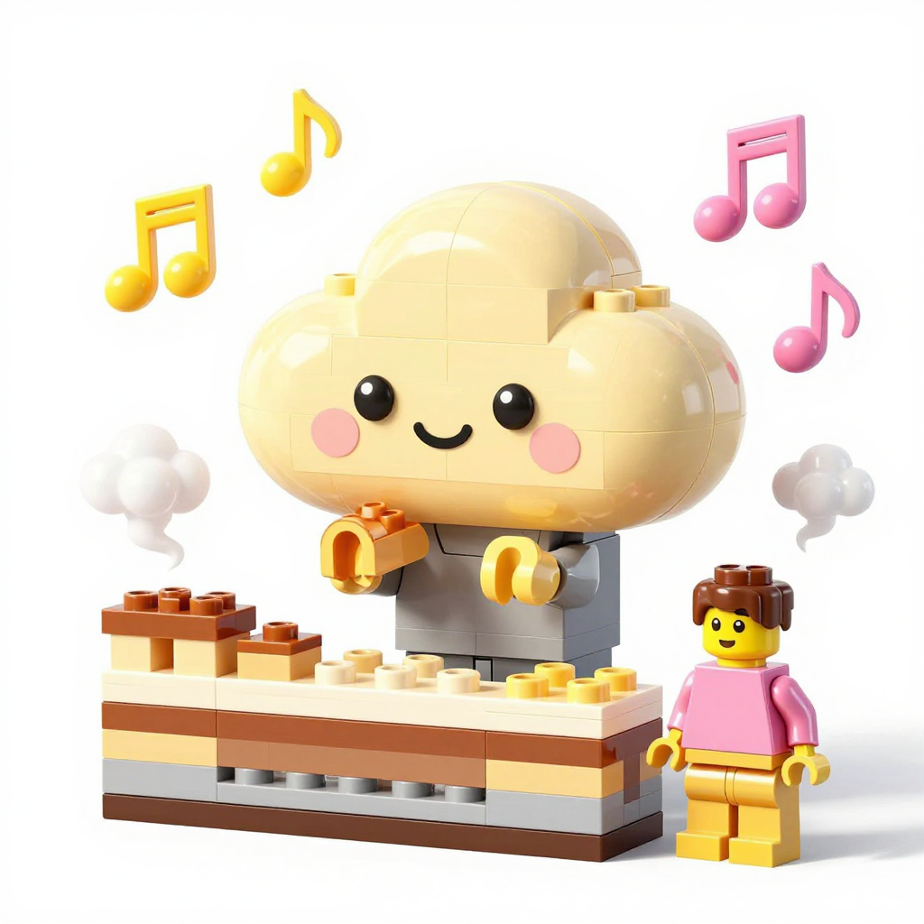 Discover Humming in this enchanting page from Sunny's A-Z adventure. Sunny the cloud hums amber joy, making bread steam dance in playful LEGO notes above the bakery. Perfect for young readers ages 3-8.