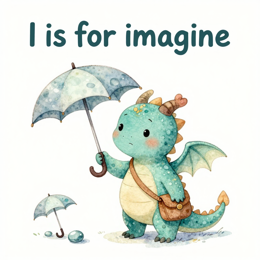 Discover Imagine in this enchanting page from Milo the Worry Dragon's A-Z adventure. Milo’s tiny umbrella shrinks worries into pocket-sized peace, painted in soft pastel dreams. Perfect for young readers ages 3-8.