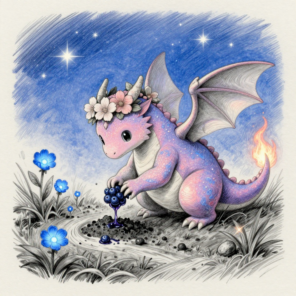 Discover Inkberry in this enchanting page from Ember's A-Z adventure. Ember pressed the inkberry deep—blue blossoms glowed, showing the badger’s way home as stars blinked awake. Perfect for young readers ages 3-8.