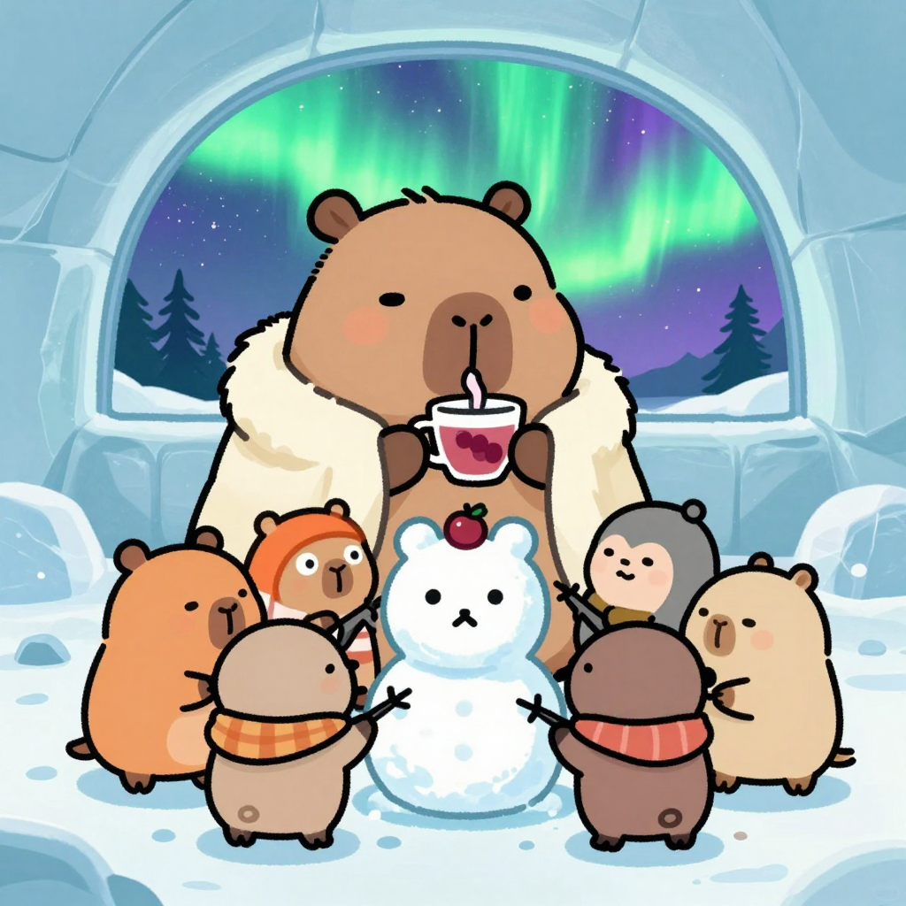 Discover Inuit in this enchanting page from Kappy's A-Z adventure. Kappy sips tea in an ice igloo as kids carve his snow statue, under dancing auroras. Perfect for young readers ages 3-8.