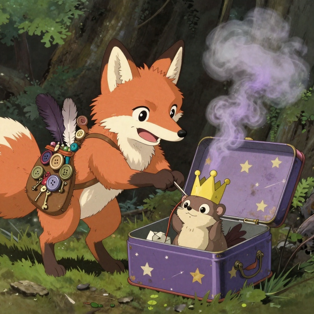 Discover Jack-in-the-box in this enchanting page from Nori's A-Z adventure. A tiny shrew in a paper crown pops out with a giggle, as lavender smoke swirls around Nori’s treasure-filled satchel. Perfect for young readers ages 3-8.