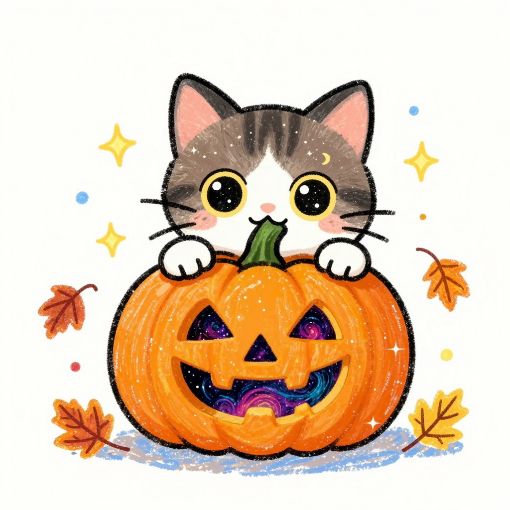 Discover Jack-o-lantern in this enchanting page from Luna Cray's A-Z adventure. Luna peeks behind a glowing jack-o-lantern, spilling stardust as leaves twirl around her paws. Perfect for young readers ages 3-8.