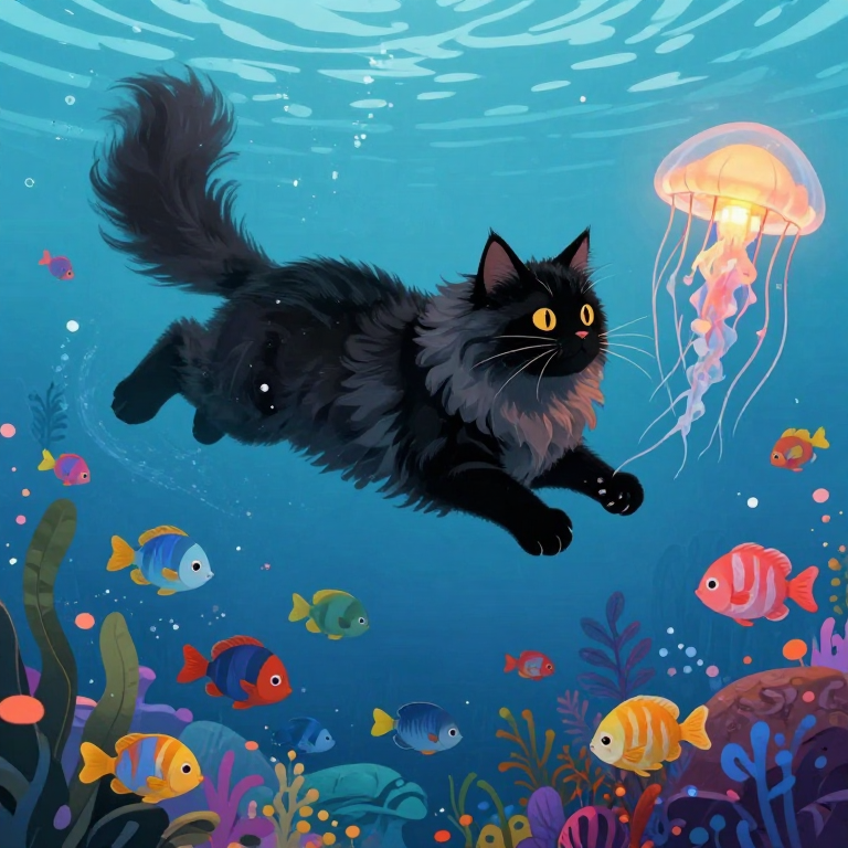 Discover Jellyfish in this enchanting page from Fluffy's A-Z adventure. Fluffy the fluffy black cat dances with glowing jellyfish in a magical underwater garden. Perfect for young readers ages 3-8.