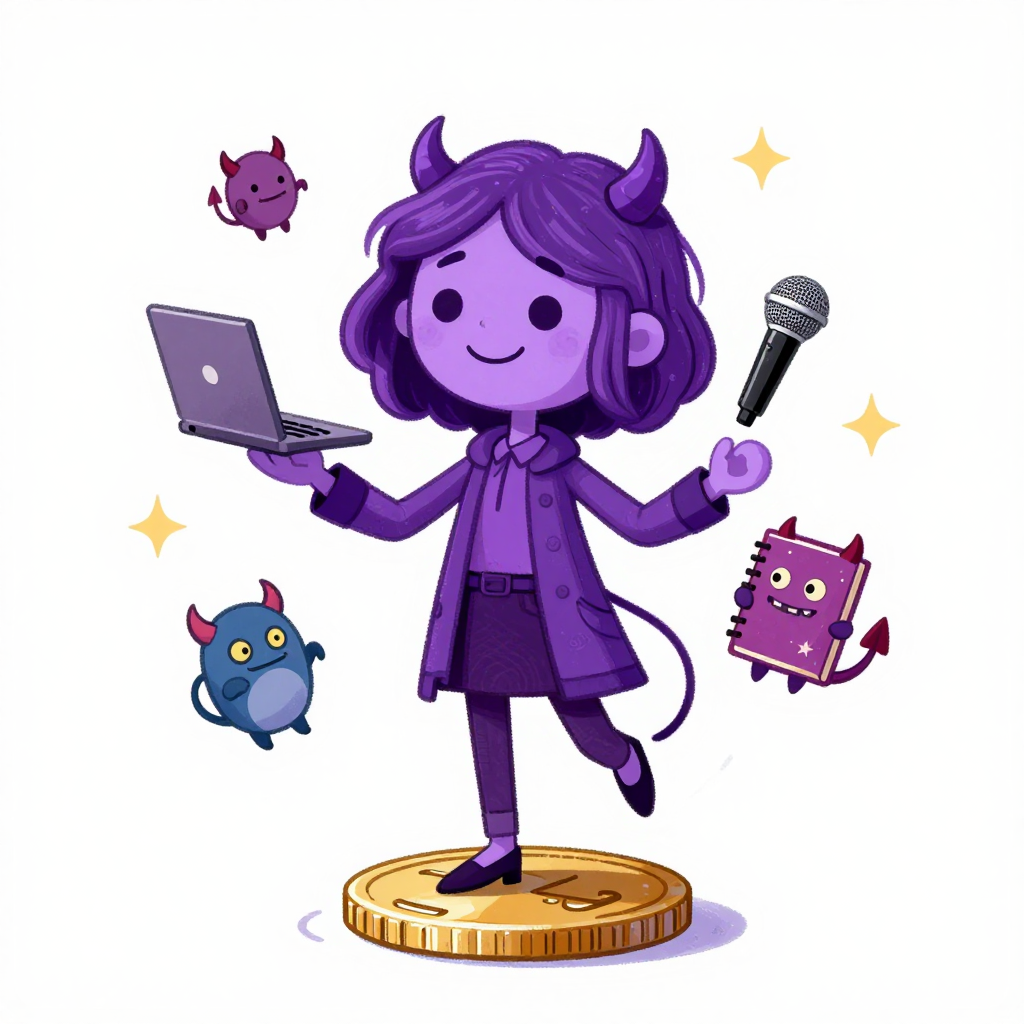 Discover Juggling in this enchanting page from Olive the Demon Hunter's A-Z adventure. Olive juggles magic tools while spinning on a coin, her hair dancing like rainbow waves. Perfect for young readers ages 3-8.