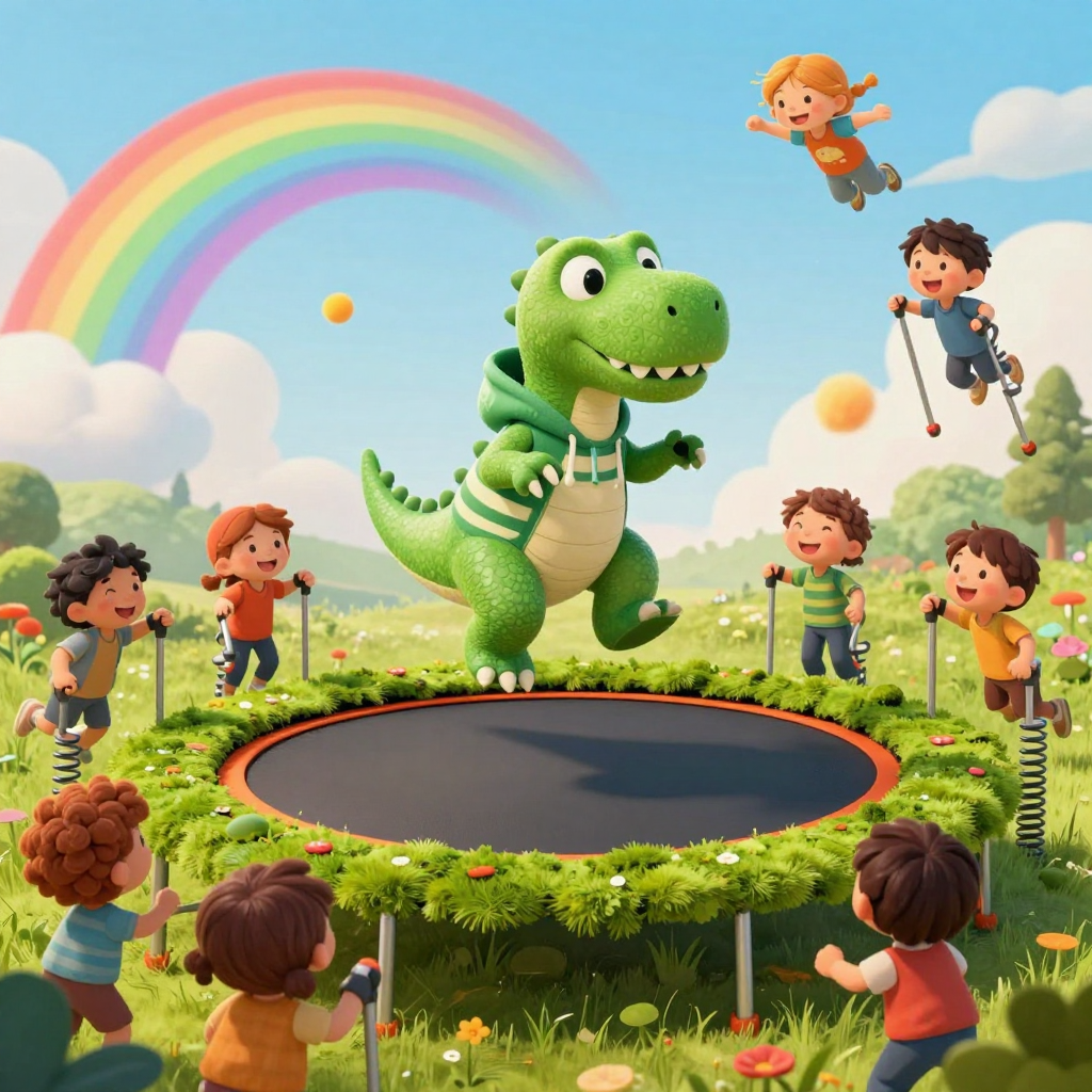 Discover Jumping in this enchanting page from Pipkin's A-Z adventure. Pipkin bounces high on mossy trampoline, friends boost him with crutches as rainbow dust swirls in the sun. Perfect for young readers ages 3-8.